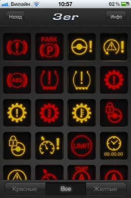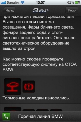 Программа Car Lights для мобильных телефонов Phone, КПК iPod touch и планшетных компьютеров iPad предназначена для владельцев автомобилей BMW и Mini. Приложение содержит полное описание всех индикаторов на приборной доске автомобиля. Программа поможет автолюбителю, если на приборной доске загорелся сигнальный индикатор, а под рукой нет руководства по эксплуатации или оно есть, но там все описано на немецком языке. В программе Car Lights имеется описание каждого сигнального индикатора, а также советы и инструкции по дальнейшим шагам по устранению или необходимых действий на конкретное предупреждение. При игнорировании предупреждающих и аварийных сигнальных индикаторов и продолжения дальнейшего движения на аварийном автомобиле, может привести к плачевным результатам и огромным финансовым затратам на технический ремонт. Поэтому данная программа поможет вам оценить возможные риски при возникшей ситуации.