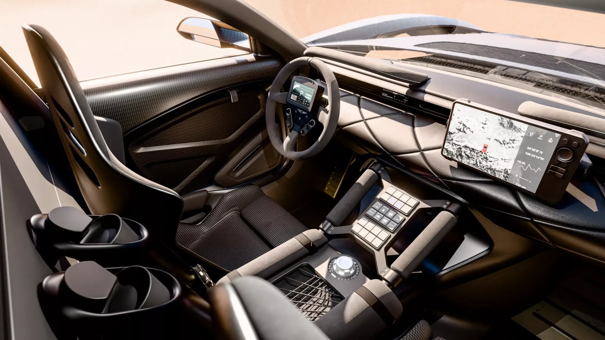 Перед пассажиром установлен экран мультимедийной системы, а на центральном тоннеле — блок из 24 кнопок для управления разными системами автомобиля. Это не похоже на «макет для выставки»: скорее на машину, которую действительно проектировали под пилотирование в сложных условиях — когда всё должно быть под рукой, а лишние детали только мешают.