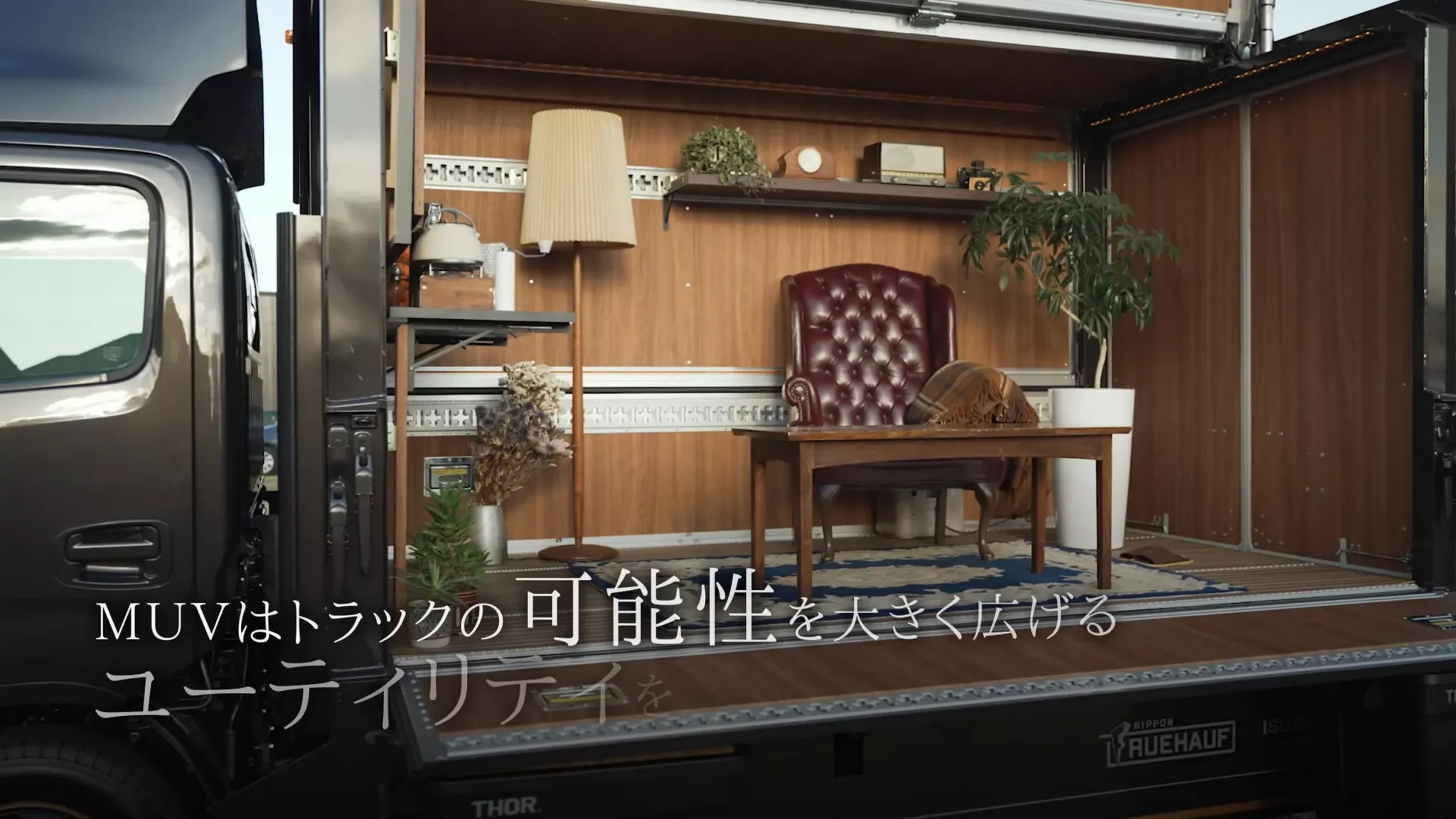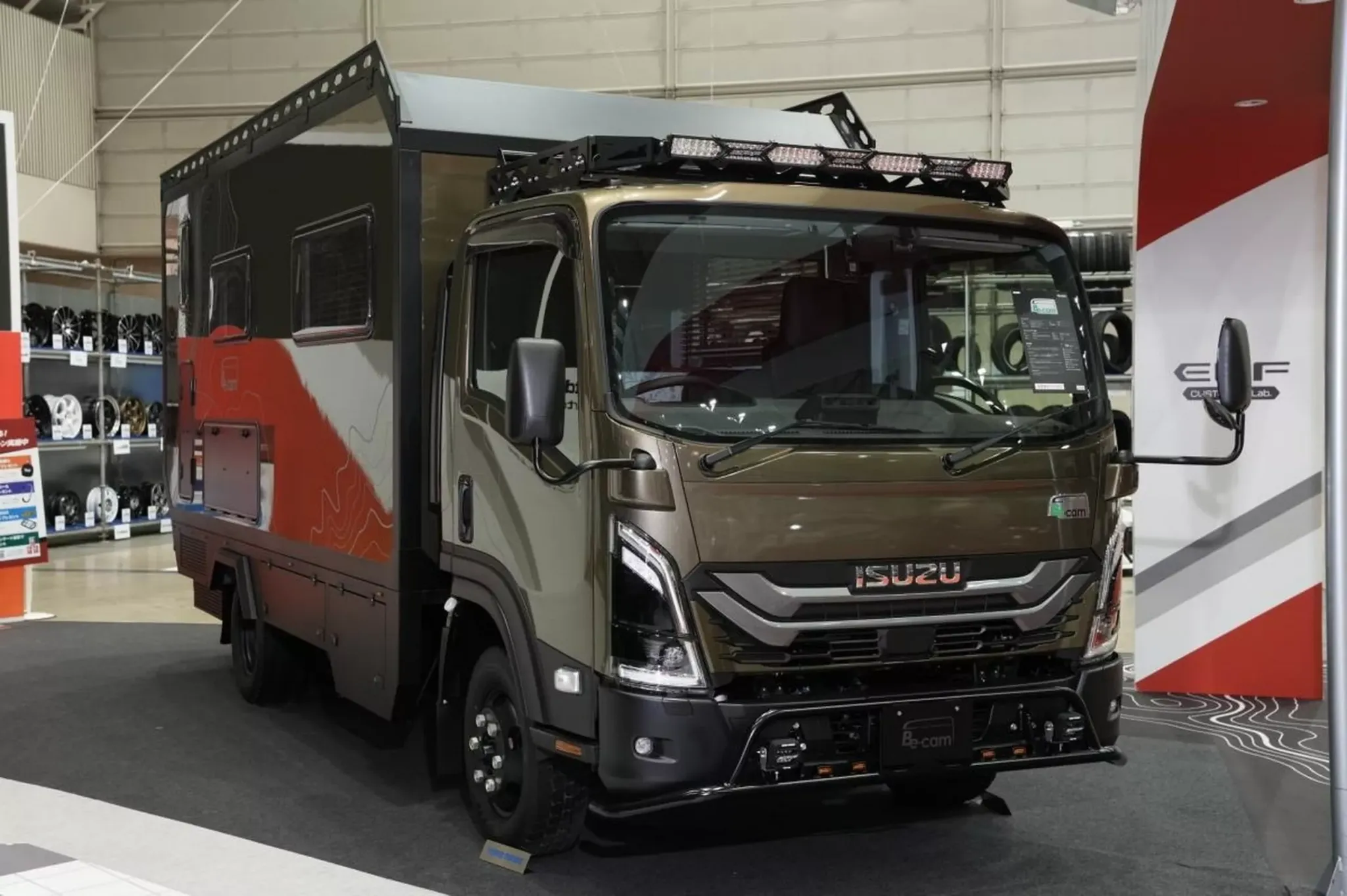 Главным героем экспозиции стал концепт Isuzu Elf MUV (Multi Utility Vehicle). За основу взяли версию со стандартной кабиной, а снаружи выделили ее черным цветом, золотистыми акцентами и обтекателями на крыше и боковинах. Однако вся идея раскрывается сзади: грузовой отсек превратили в пространство для отдыха и демонстраций. Боковая стенка опускается, а большая дверь поднимается вверх, словно крыло, образуя навес и «витрину» для интерьера.