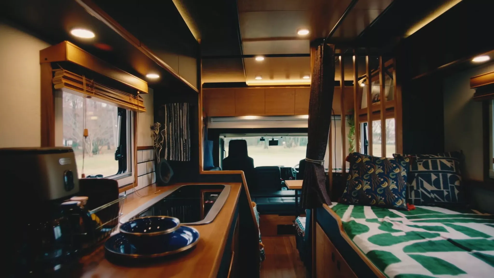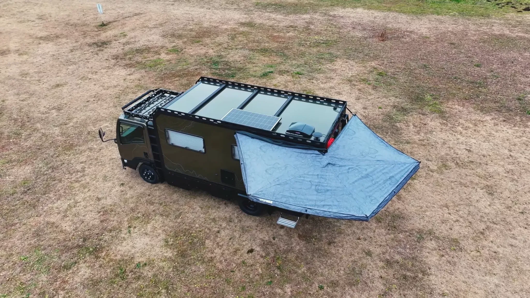 Интерьер GeoRoam выглядит как маленькая квартира. Там есть зона для приема пищи, полноценная кухня, диван, который раскладывается в спальное место, и отдельная задняя спальня. Для вечеров предусмотрели проектор — решение не обязательное, но очень «в тему», если задача — провести ночь не в палатке, а в тепле и комфорте. Разработкой этого варианта занимались вместе с Nippon Tokushu Body.