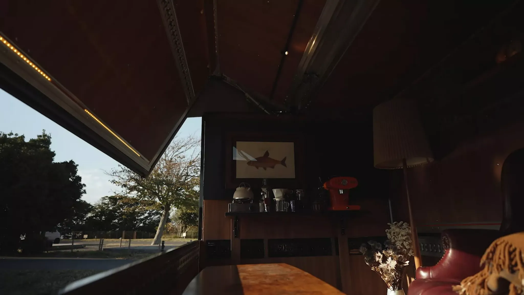Внутри — вовсе не привычный пластиковый «техничный» салон, а теплая, почти домашняя обстановка. Деревянный пол, направляющие и крепежные рейки, модульные полки, а главное — нормальная мебель. Центральный элемент — диван, на котором можно устроиться с видом на площадку или на природу, если машина припаркована у воды или на смотровой точке. Рядом предусмотрен откидной столик: в презентационном ролике его используют как «кофейную станцию» — с таким форматом Isuzu Elf MUV легко представить в роли мобильной точки для дегустаций, небольшого шоу-рума или промо-стенда.