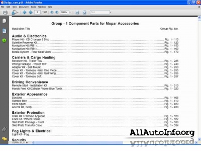 Chrysler, Jeep, Dodge Parts Catalogue's 1981-2009 - Полные каталоги по подбору запчастей для автомобилей Chrysler, Dodge и Jeep в которых дается информация обо всех деталях, устанавливаемых на этих автомобилях. Данные в PDF файлах на выбранный автомобиль содержат информацию по запчастям со всеми возможными вариациями устанавливаемых на эту модель двигателей, коробок передач, шасси, электрооборудования и других деталей. Каждый каталог запчастей разбит по марке автомобиля и его году производства. Каталог содержит информацию по автомобилям Chrysler, Jeep и Dodge, которые выпускались компанией в период 1981 по 2009 год. Все файлы представлены в формате PDF. Также вы найдете информацию по расшифровке номера кузова, шасси, двигателя, идентификационного кода автомобиля и узнаете месторасположение табличек с номерами на автомобиле. Кроме этого в каталогах содержится список аббревиатур и сокращений, размеры, техническая информация и многое другое.
