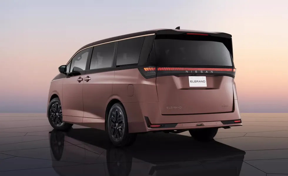 Elgrand 2026 выглядит далеко не как прежнее поколение: передняя часть украшена более чем двумя десятками пиксельных светодиодов, встроенных в оформление решётки, а задняя световая полоса также выполнена в виде светового «барьера», подчёркивающего ширину кузова. Линия крыши остаётся высокой, что обеспечивает простор в салоне, но стильный акцент делает автомобиль ближе к премиум-MPV. Задние раздвижные двери (с обеих сторон) подчёркивают семейный характер модели.