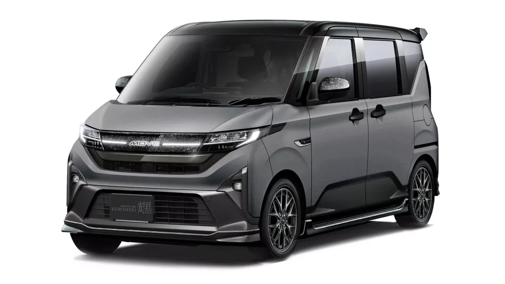 Противоположный характер у Move Kuromeki. Здесь дизайнеры сделали ставку на агрессивный визуальный стиль: тёмная матовая окраска, выразительный аэродинамический обвес, крупные колёса и более строгая отделка салона. Автомобиль выглядит значительно солиднее и спортивнее, чем серийный вариант, показывая потенциал модели для более эмоциональных исполнений.