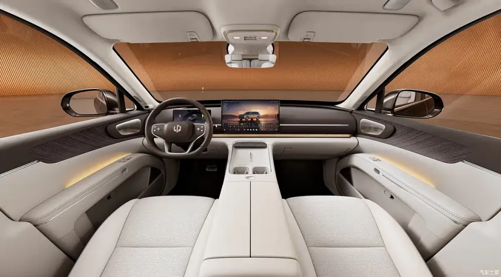 Интерьер Leapmotor D19 выполнен в минималистичном, но технологичном стиле. Центральное место занимает крупный горизонтальный сенсорный дисплей мультимедийной системы, дополненный цифровой приборной панелью. Архитектура салона подчёркивает ориентацию на семейное использование: широкая центральная консоль, продуманная эргономика и большое количество ниш для хранения.
