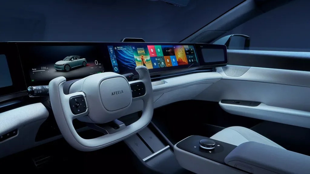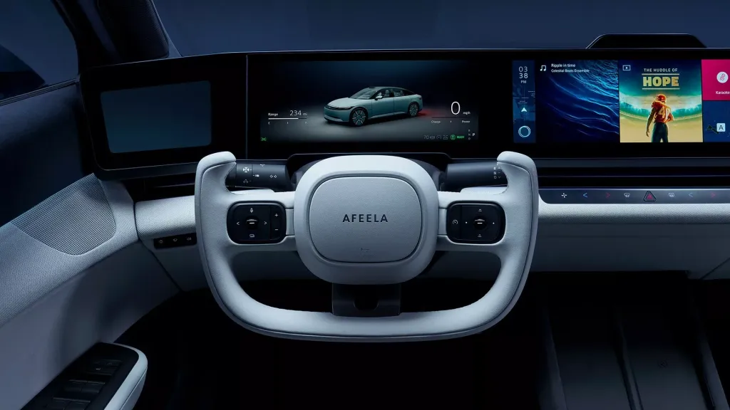 Главное, что отличает Sony Honda Afeela 1 от конкурентов, — интерьер. Передняя панель полностью занята панорамным экраном, который объединяет приборную панель, мультимедийную систему и развлекательный центр для пассажиров. Именно здесь проявляется влияние Sony: интерфейс напоминает современную цифровую платформу, а не классическую автомобильную мультимедиа.