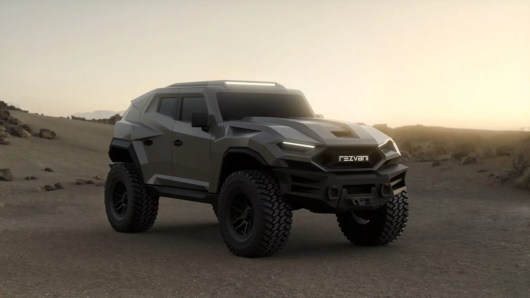 Rezvani Tank 2026 выделяется угловатым, нарочито агрессивным обликом. Кузов выполнен в стиле военной техники: плоские панели, острые грани, массивные колёсные арки и минималистичная оптика создают образ «дорожного броневика». Высокий клиренс, внедорожные колёса большого диаметра и усиленные бамперы подчёркивают ориентацию автомобиля на тяжёлые условия эксплуатации — от бездорожья до экстремальных сценариев выживания.