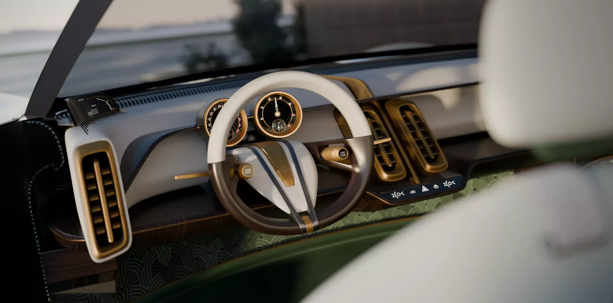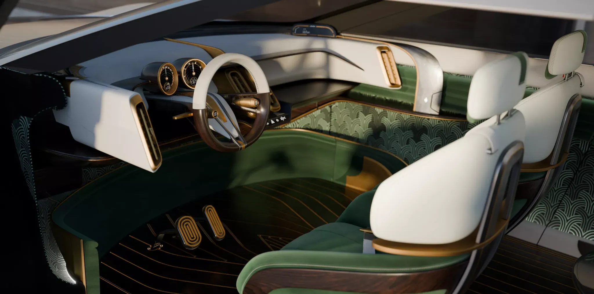 Интерьер — отдельная глава. L’Epoque рисуют как «передвижную гостиную»: в задней части вместо привычного ряда сидений — большой диван и два дополнительных кресла, которые появляются по необходимости, плюс центральный модуль, который можно превратить в мини-бар, хранилище для сигар, шкатулку для часов или другое личное пространство владельца. Логика проста: пассажир должен чувствовать себя не в дороге, а в приватной комнате, где всё подчинено отдыху. Поэтому экраны предлагается прятать и показывать только по необходимости, оставляя салон визуально спокойным. Материалы подчёркнуто «живые»: дерево, кожа, ткани, тёплые оттенки и декоративные акценты под металл создают атмосферу дорогой мебели, а не гаджета на колёсах.