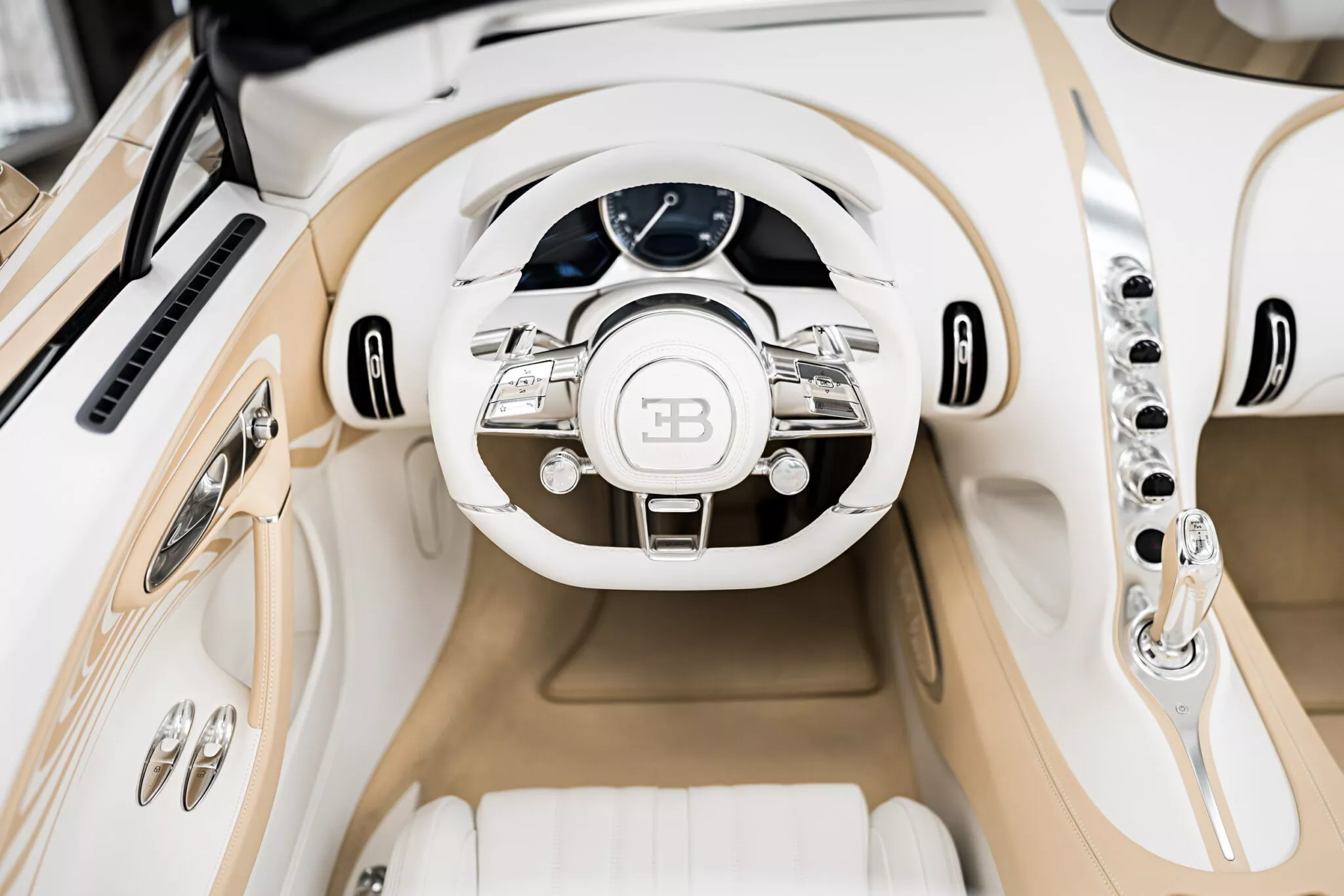 В салоне Bugatti тоже сделала ставку на эффект «чистого света». Белая кожа сочетается с декоративными вставками и золотистыми штрихами, а часть углепластиковых элементов окрашена в белый цвет, чтобы поддержать общую идею. На сиденьях, дверных панелях и даже в области селектора передач встречается знаменитый мотив «Танцующий слон» — отсылка к наследию Рембрандта Бугатти, чьи работы давно стали частью визуального кода марки.