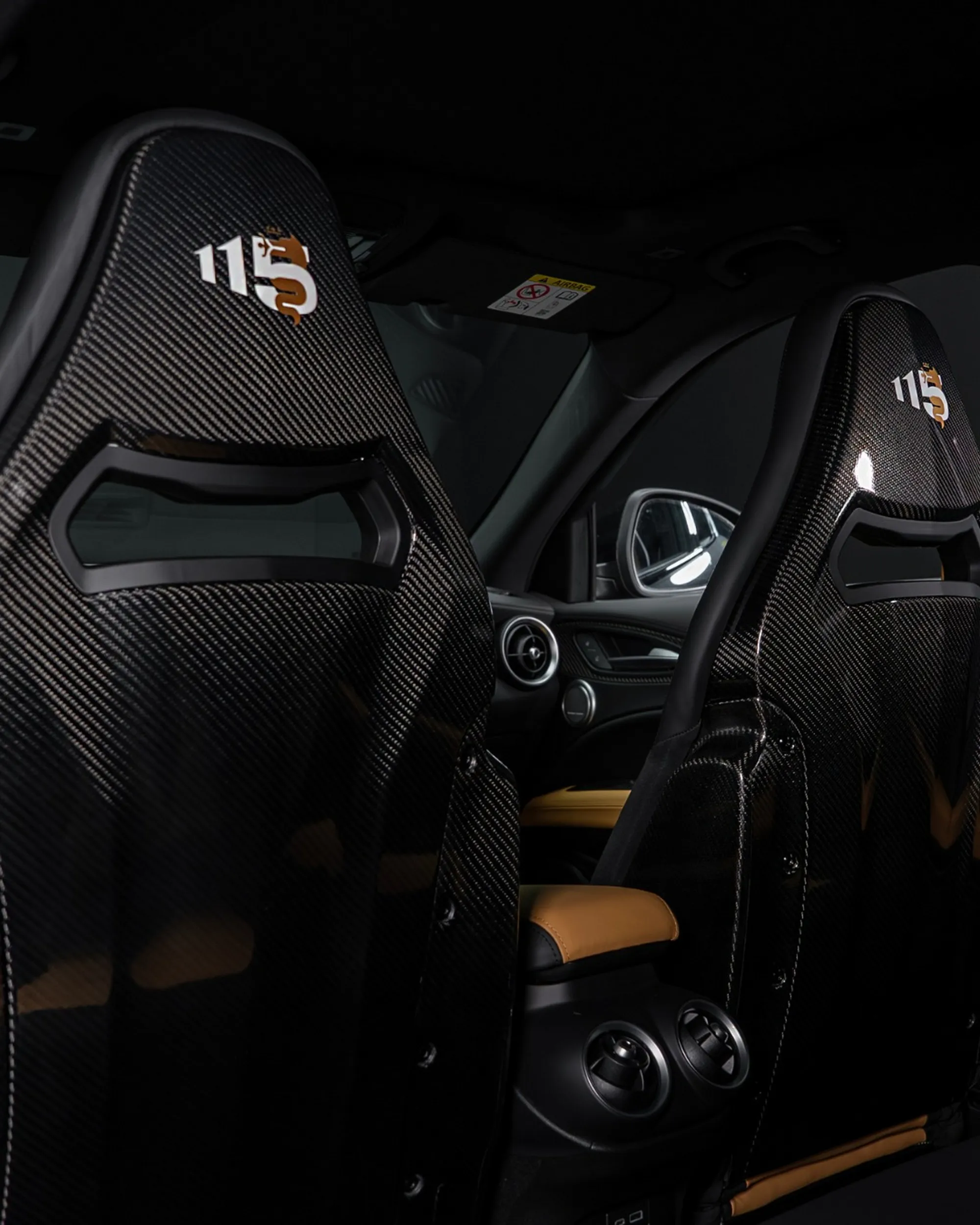 Giulia QV 115 получила черный кузов с графикой в виде фирменного герба Alfa Romeo на капоте. Золотым цветом выделены колесные диски, тормозные суппорты, передний сплиттер и боковые юбки. Логотипы 115th Anniversary размещены на карбоновых зеркалах, суппортах, крышке багажника и даже на карбоновых спинках сидений. В салоне используется сочетание черной и оранжевой кожи, а на подголовниках нанесена маркировка 1-of-5.