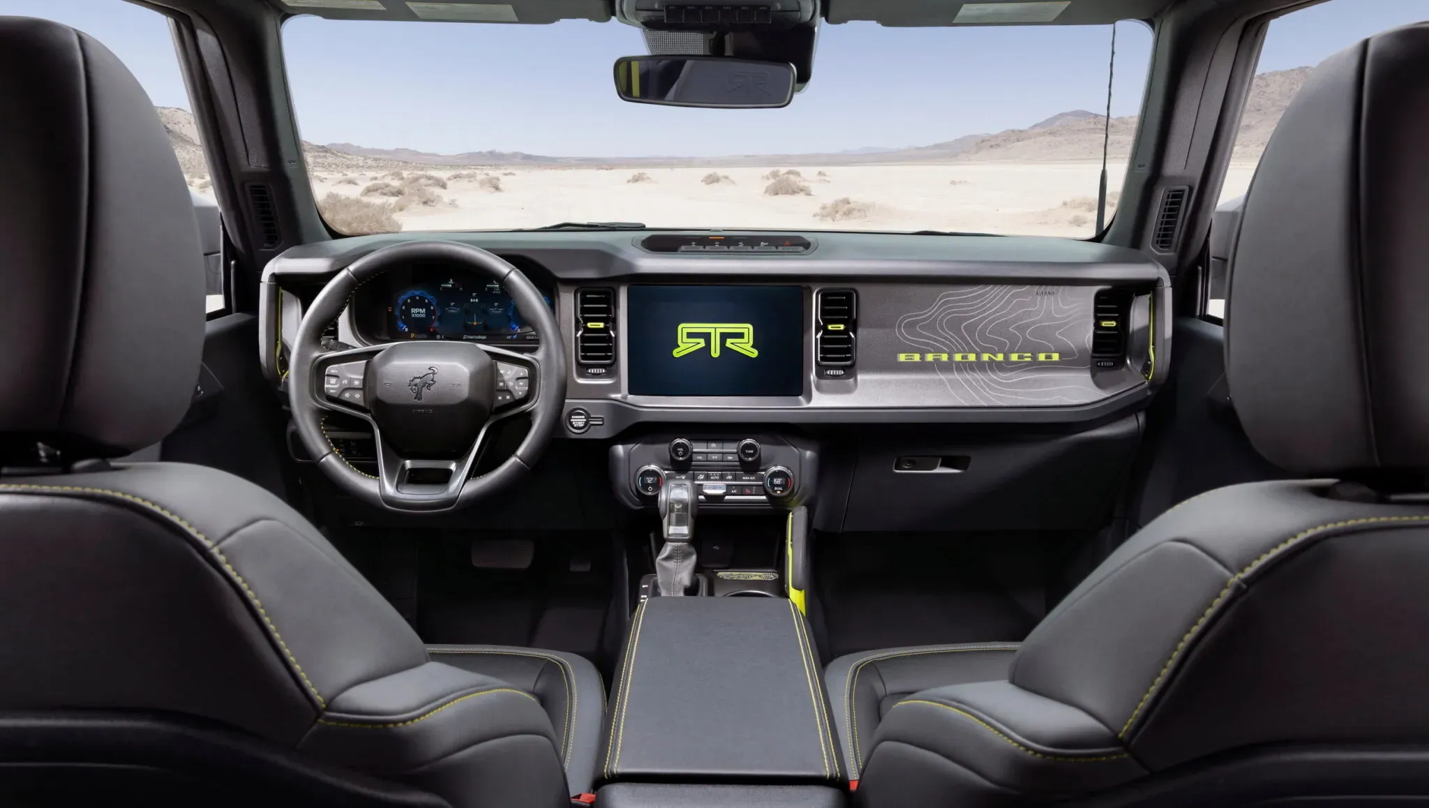 Центральным мотивом салона стал яркий оттенок Hyper Lime. Он появляется на декоративных вставках передней панели, поручнях, ремнях безопасности и контрастной прострочке. На фоне черной кожаной отделки этот цвет работает очень агрессивно и специально перекликается с внешними акцентами автомобиля. Ford не пытается подать Bronco RTR как сдержанную внедорожную версию. Напротив, вся подача построена на том, чтобы водитель постоянно видел и чувствовал уникальность исполнения, даже в самых бытовых действиях вроде регулировки дефлектора вентиляции или пристегивания ремня.