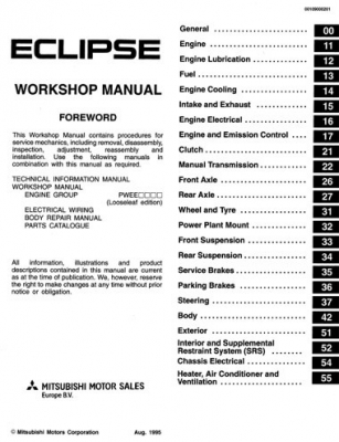 Mitsubishi Eclipse Workshop Manual 1995 - Оригинальное руководство по ремонту и обслуживанию автомобилей Mitsubishi Eclipse 1995 года выпуска. Руководство содержит технические характеристики, информацию по расшифровке Вин кода автомобиля, инструкции по техобслуживанию и ремонту узлов автомобиля, электрические схемы оборудования и многое другой полезной информации. Представленная информация разделена по главам, в которых вы найдете инструкции и иллюстрации по ремонту определенного узла и агрегата. Все инструкции Mitsubishi Eclipse Workshop Manual 1995 шаг за шагом описывают процесс снятия, установки и регулировки узлов и агрегатов автомобиля.