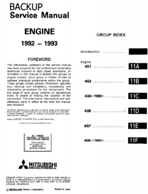 Mitsubishi Engine 4G1, 4G3, 4G6, 4G9, 6G7 Service Manual (1992-1993) - Заводское руководство по ремонту и техническому обслуживанию четырехцилиндровых двигателей, которые выпускались с 1992 по 1993 год и устанавливались на многих моделях автомобилей компании. В руководстве подробно описаны инструкции по демонтажу и монтажу двигателей, даны основные характеристики, справочные данные. Описаны методы поиска и устранения неисправностей в двигателях. Все этапы демонтажа и монтажа узлов двигателя хорошо продемонстрированы на иллюстрациях и изображениях. Описан весь инструментарий и дополнительное оборудование, используемое при выполнении технических работ. Для каждой технической операции имеется информация по технике безопасности с указанием действии по предотвращению различных травм и увечий при выполнении ремонтных работ. Также схематично показан порядок установки узлов двигателя и затяжки резьбовых соединений. Полное руководство Mitsubishi Engine 4G1, 4G3, 4G6, 4G9, 6G7 Service Manual (1992-1993) содержит описание методов и технологий, используемых в сервисных станциях технического обслуживания компании Митсубиши. Это позволяет быть уверенным в том, что если соблюдать порядок выполнения всех ремонтных работ и использовать соответствующие инструментарий и оборудование, можно выполнить ремонт двигателей Mitsubishi 4G15, 4G37, 4G61, 4G63, 4G64, 4G93, 6G72 не хуже мастеров станций технического обслуживания.