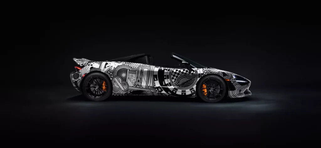 Рисунки и графика «Sketch in Motion» охватывают кузов: символические элементы азартных игр (кубики с годами основания Лас-Вегаса и McLaren), силуэт штата Невада, неоновые стрелки, декоративные карты и винтажный шлем Бруса Макларена.