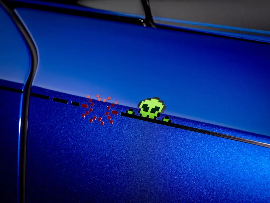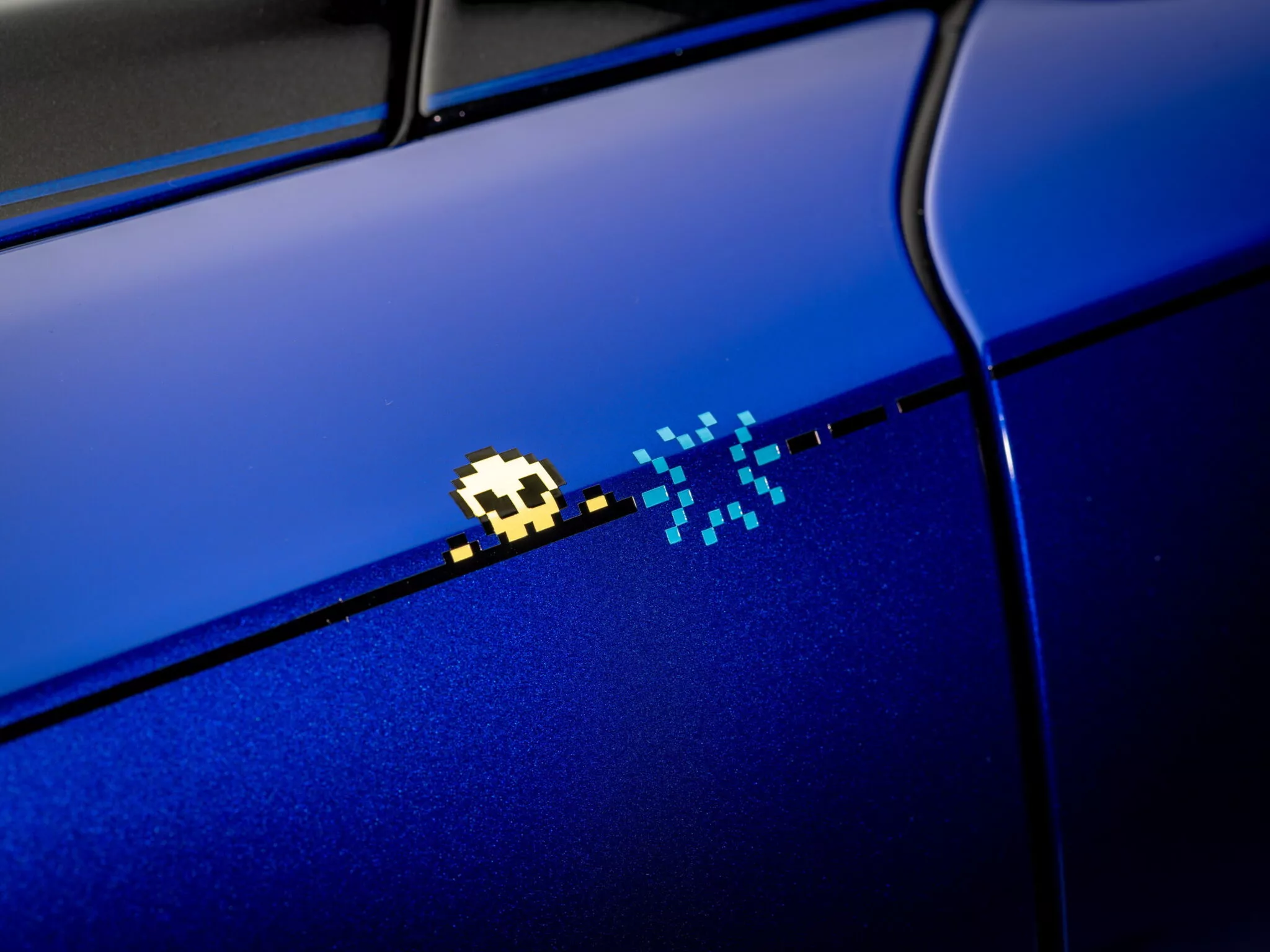 Вдоль нижней части дверей и по порогам нанесён характерный пиксельный узор, напоминающий классические «игровые уровни» — ступени, квадраты, лестницы и платформы. Контрастные белые и ярко-голубые элементы создают иллюзию движения, будто автомобиль едет по уровню старой видеоигры.