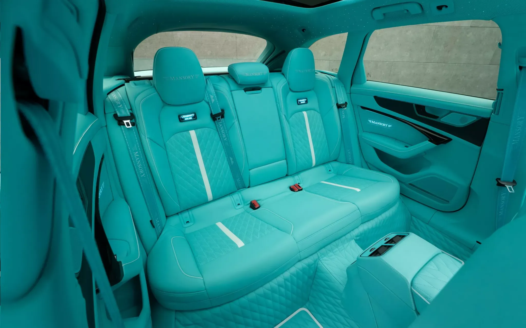 Салон Mansory RS6 Avant — это полная противоположность строгому интерьеру Audi. Практически все поверхности обиты кожей яркого бирюзового оттенка, дополненной декоративной строчкой и фирменными вставками Mansory. Центральная консоль, панели дверей и сиденья получили эксклюзивный дизайн, а потолок украшен эффектом «звёздного неба».