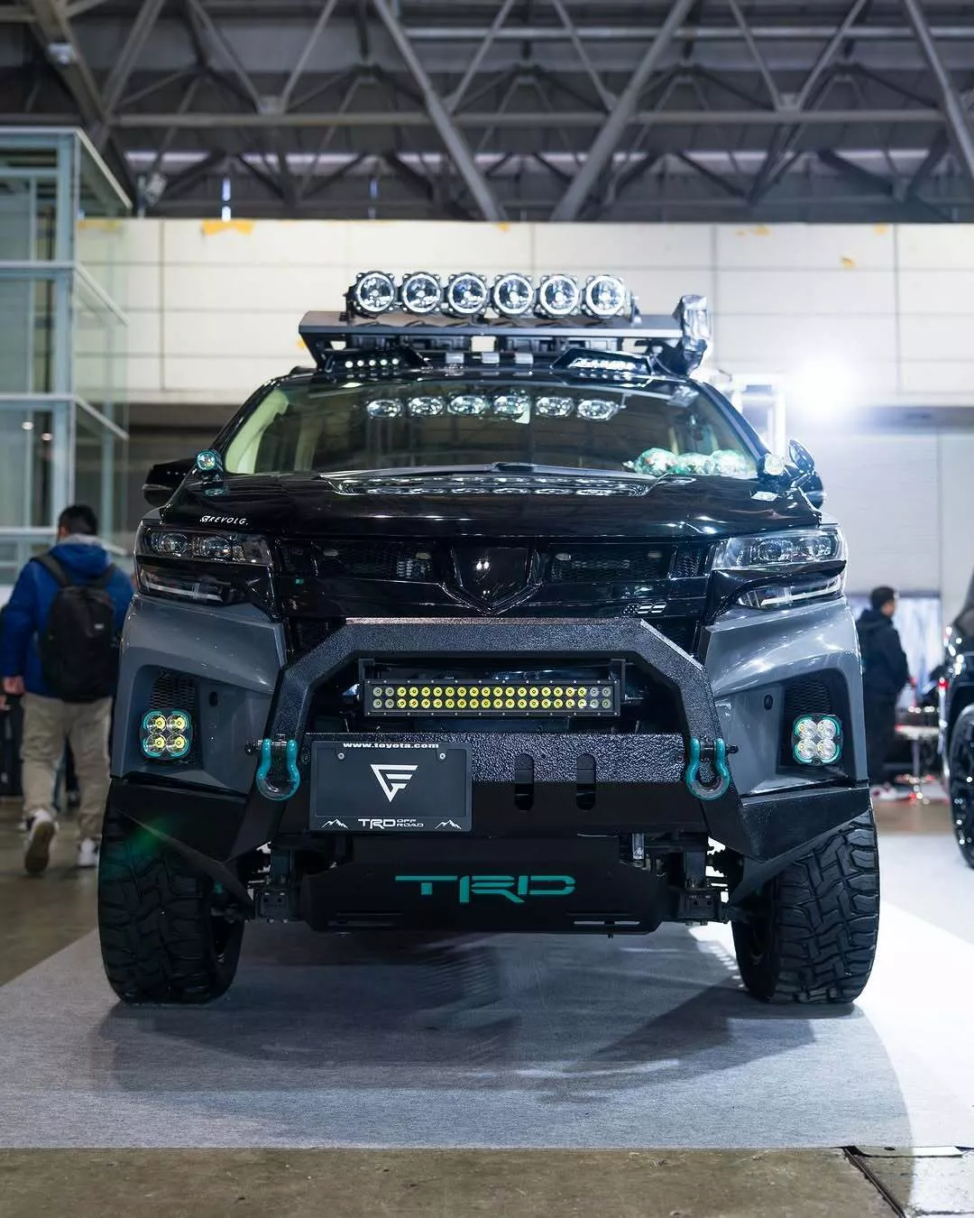Спереди Alphard получил новый стальной бампер и защиту снизу с маркировкой TRD. В комплект также входит силовая передняя дуга и светодиодная балка. Дополнительно установлены светодиодные огни в зоне передних воздухозаборников. В сумме это формирует «силовую» композицию, которая визуально делает минивэн ближе к внедорожной теме и подчёркивает «подготовленный» характер.