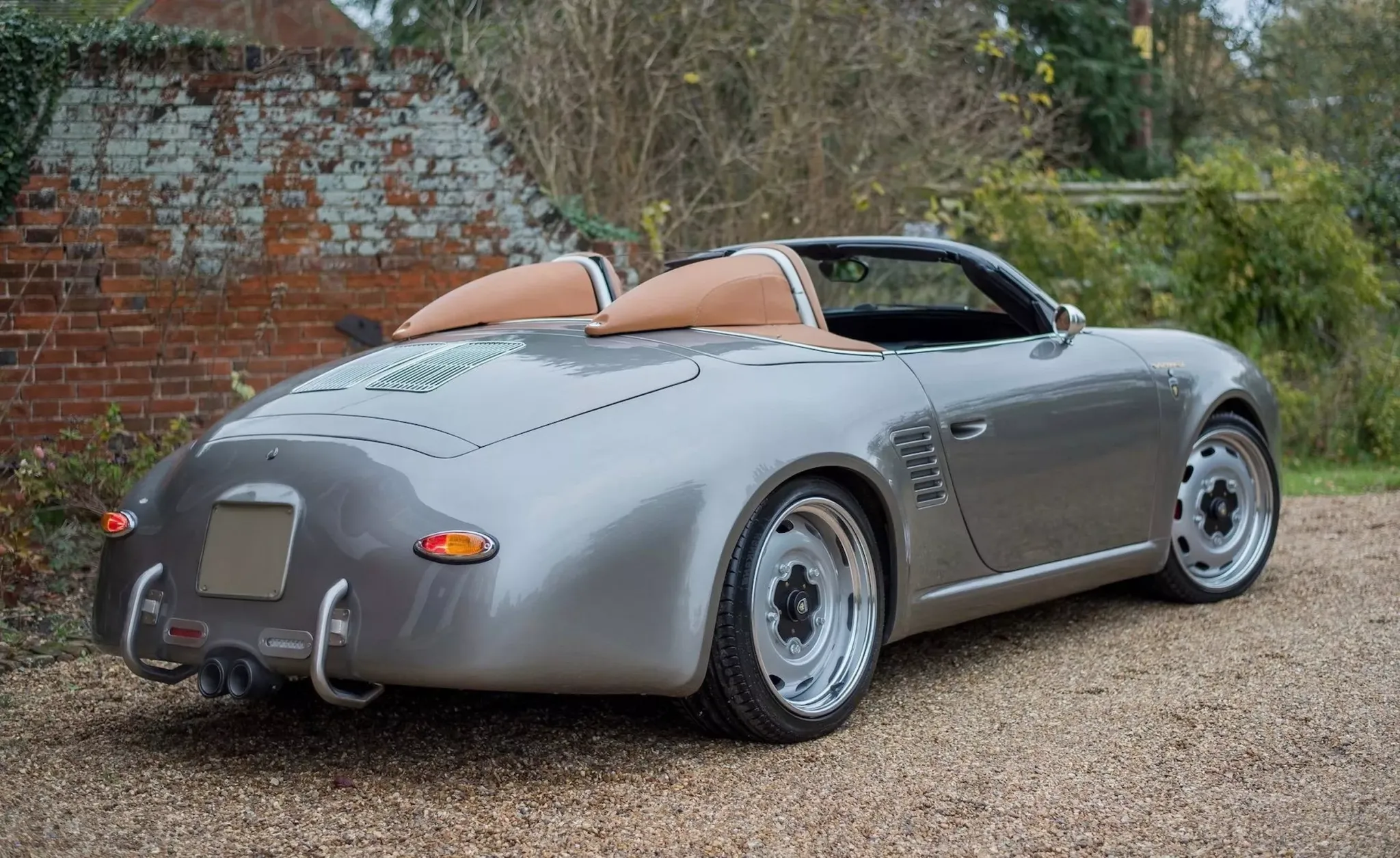 В набор внешних отличий входят хромированный декор, круглые светодиодные фары, «каплевидные» задние фонари, а также характерные обтекатели-«горбы» за сиденьями — как у классических спидстеров. Отдельно подчеркивается работа с аэродинамикой: сзади установлен функционирующий спойлер, а боковые воздухозаборники Boxster закрыты специальными накладками, чтобы не ломать ретро-образ. Колеса — 19-дюймовые, с фирменным дизайном под проект. При этом мягкая крыша с электроприводом остается от донора — практичность и ежедневная пригодность никто не отменял.