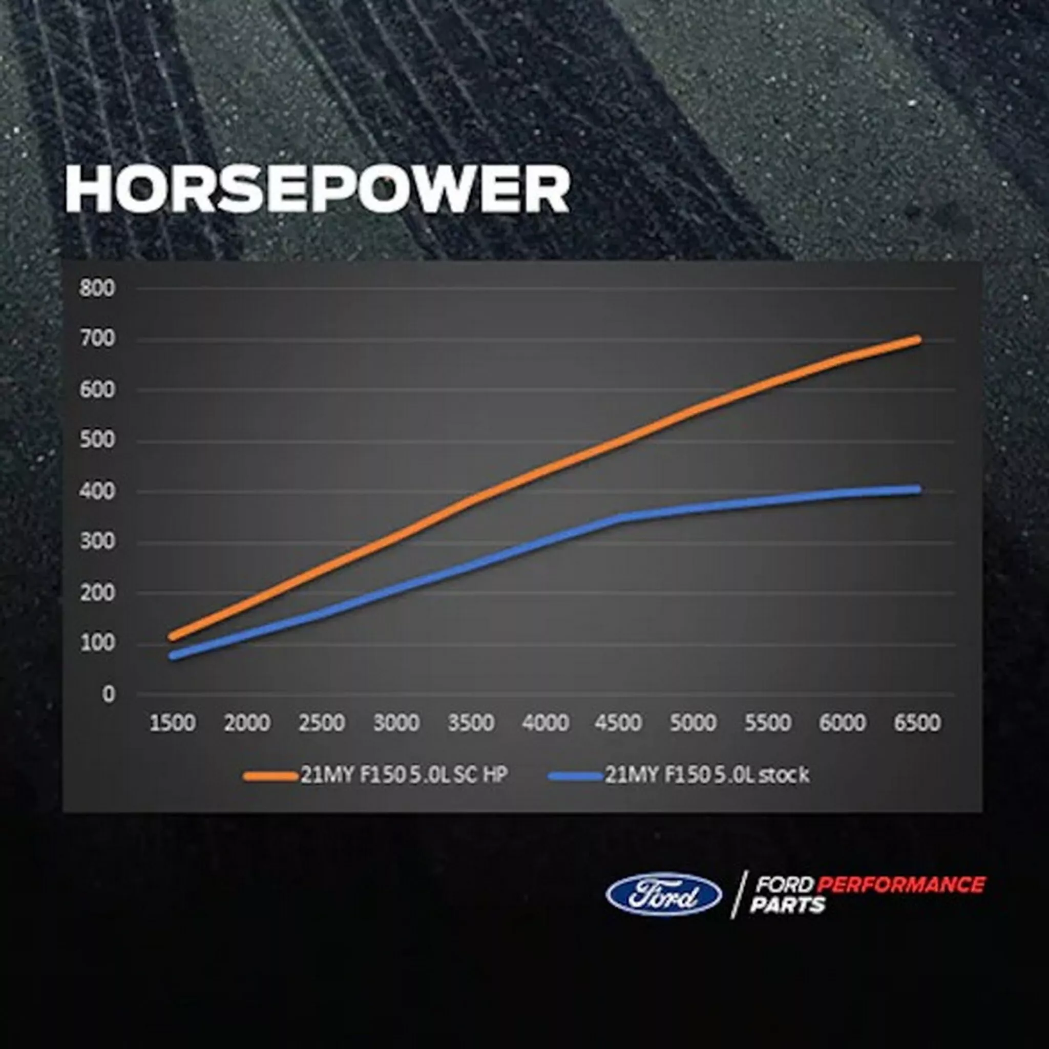 Не менее интересным выглядит и вариант для Ford F-150. Для пикапа с двигателем 5.0 литра Ford Performance подготовил отдельный компрессорный комплект, который поднимает отдачу до 700 л.с. при 6500 об/мин и 590 фунт-фут крутящего момента при 5000 об/мин. Для тяжелого и крупного автомобиля такого класса это очень серьезная прибавка, которая делает дорожный F-150 заметно злее и динамичнее, особенно в версиях, ориентированных не столько на перевозку грузов, сколько на быструю езду по шоссе.